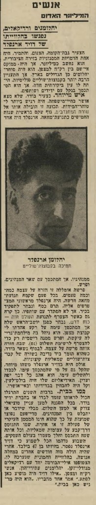 דוד ארנפלד (הולנד 1929-ישראל 1975). דוד הגיע לארץ ב 1936 עם הוריו אלברט ובלה ואחיו, יהודה ומירה. בצעירותו היה פעיל בצופים ובאצ"ל ובבחירות הראשונות ב 1949 הצביע לחירות. באותה שנה גם יצא להולנד בשליחות מטעם הצופים. ב 1951 הגיע לקיבוץ בית העמק ואף היה לכמה חודשים מזכיר הקיבוץ אך הוא עוזב את הקיבוץ וב 1952 מתחיל לעבוד בענף היהלומים. בין 1953 ל 1958 הוא פעיל בשורת המתנדבים ולאחר מכן תנועת המשטר החדש. ב 1965 היה פעיל מרכזי בתנועת העולם הזה ושם הכיר גם את חברי מצפן, הארגון הסוציאליסטי המהפכני. בספטמבר 1967 יזם, חתם ומימן מודעה שהתפרסמה בעיתון הארץ וקראה לצאת מיד מהשטחים הכבושים. דוד תמך במחזאי חנוך לוין, ובשורה של מיזמים כלכליים, חברתיים ותרבותיים שקידמו צדק, שוויון ושלום. הוא נפטר ב 1975 מסרטן ונקבר בבית העלמין קריית שאול.