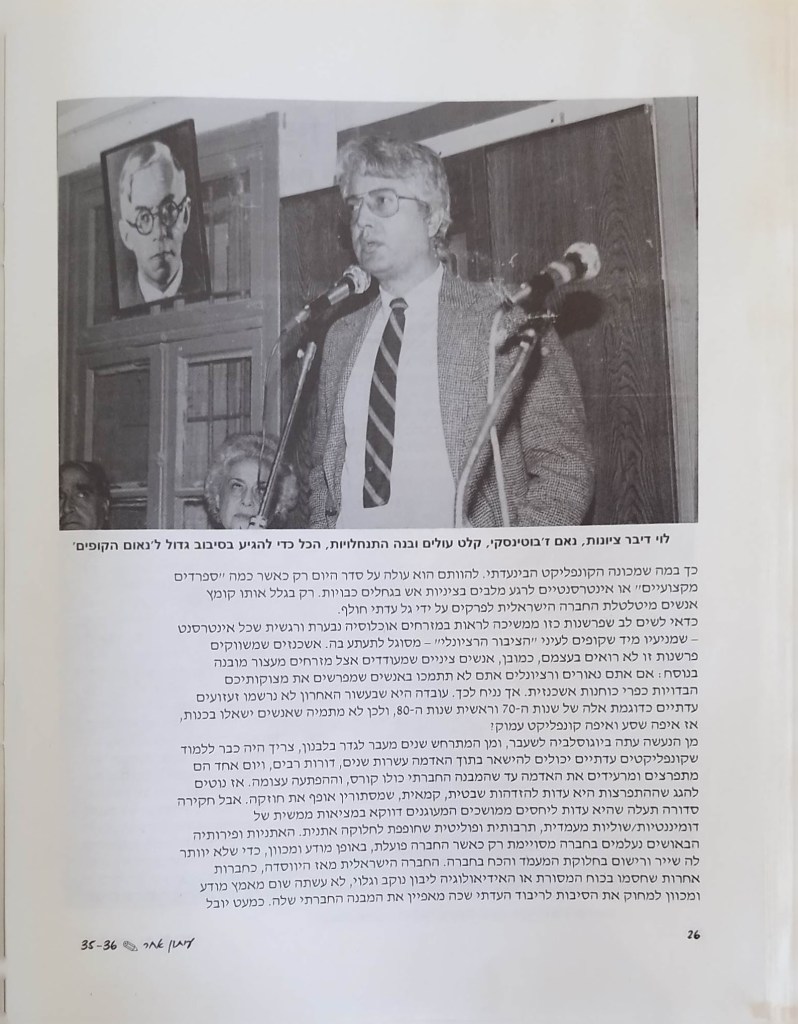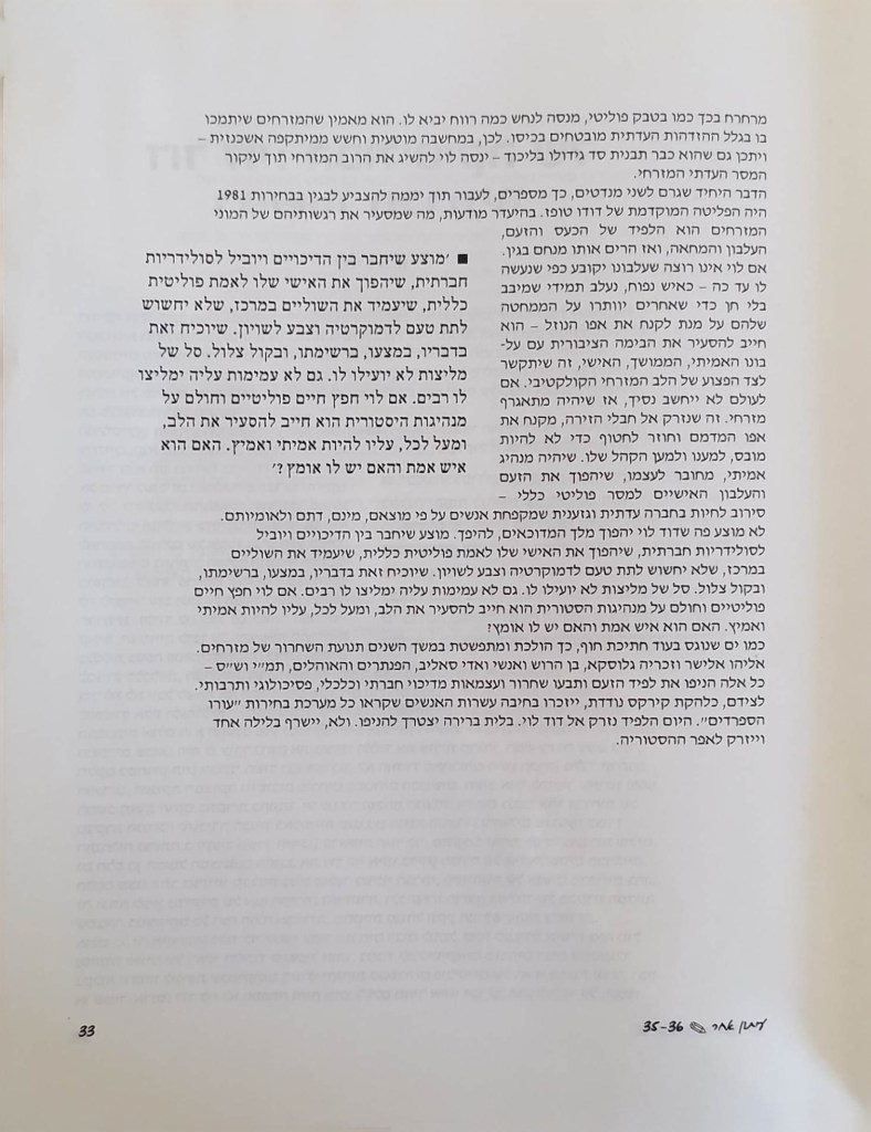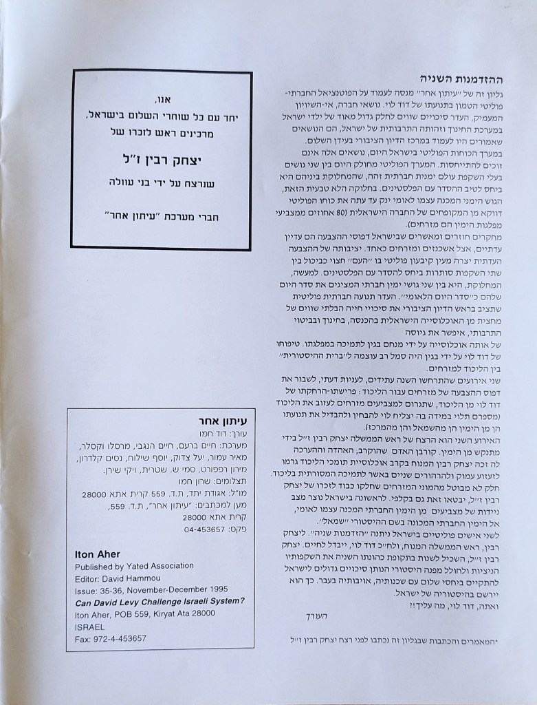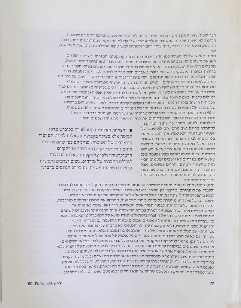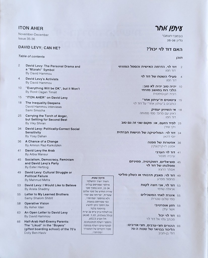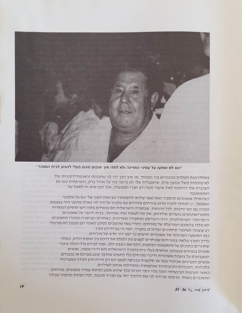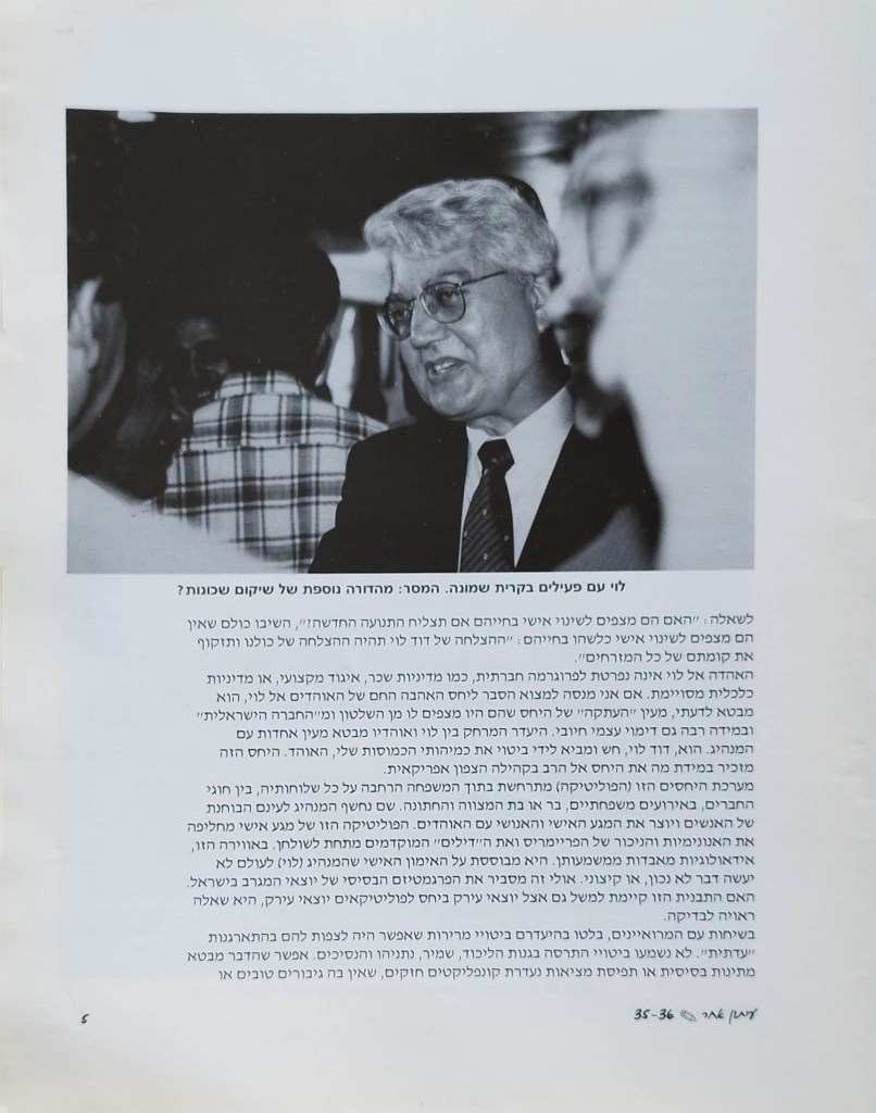 גליון 35-36 | נובמבר-דצמבר 1995 | עורך: דוד חמו | מערכת: חיים ברעם, חיים הנגבי, מרסלו וקסלר, מאיר עמור, יעל צדוק, יוסף שילוח, נסים קלדרון, מירון רפפורט, סמי שלום שטרית, ויקי שירן | תצלומים: שרון חמו