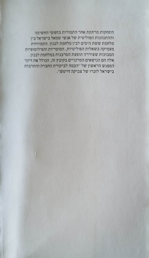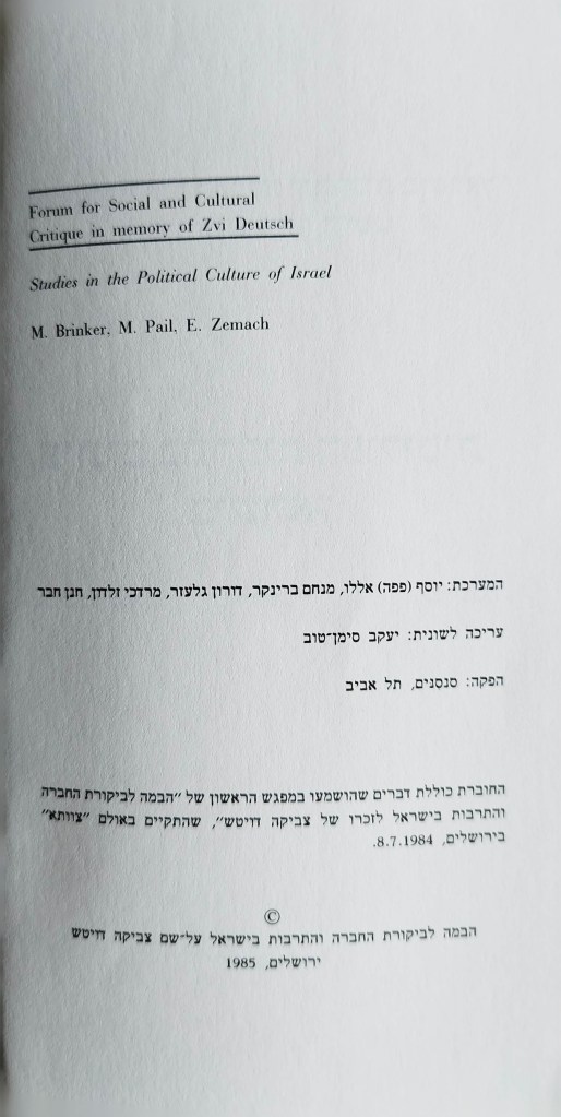 עיונים בתרבות הפוליטית בישראל פורסם בתאריך ינואר 9, 2024ינואר 9, 2024 מאת erantorbiner מאיר פעיל | מנחם ברינקר | עדי צמח | הבמה לביקורת החברה והתרבות בישראל לזכרו של צביקה דויטש | ירושלים | 1985 שתף לחיצה לשיתוף ב-X (נפתח בחלון חדש) X לחיצה לשיתוף בפייסבוק (נפתח בחלון חדש) פייסבוק אהבתי טוען... קשור