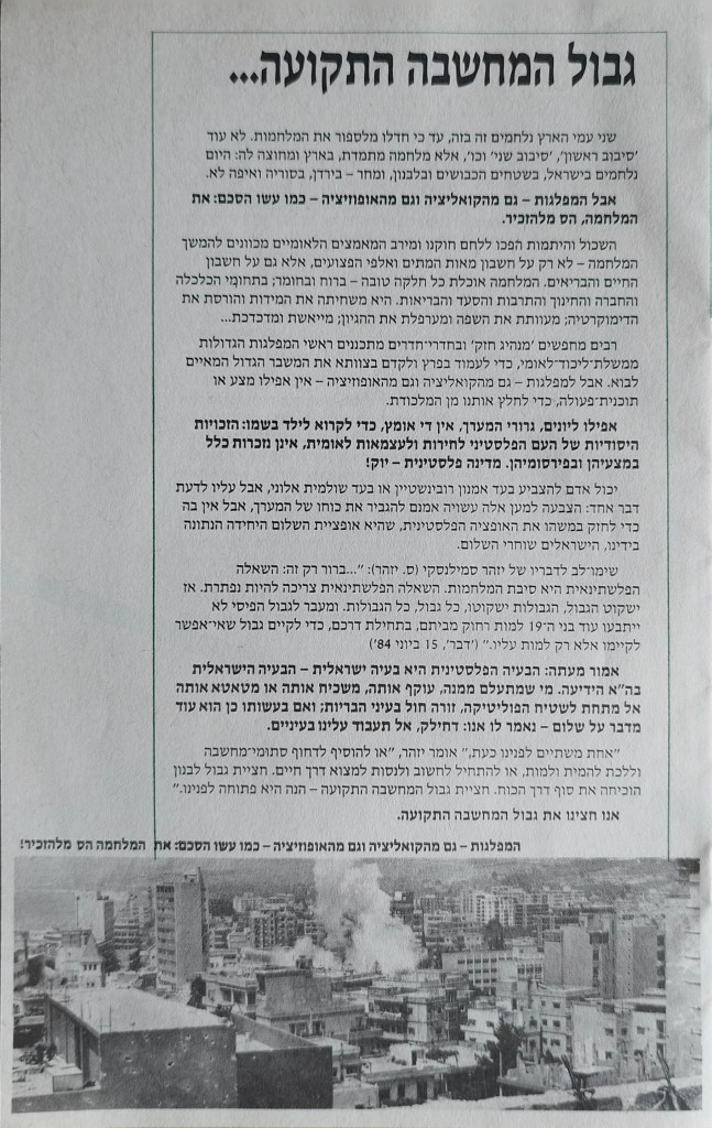 קו ירוק |נגד המלחמה הבאה פורסם בתאריך ינואר 29, 2024 מאת erantorbiner הרשימה המתקדמת לשלום | יוני 1984 שתף לחיצה לשיתוף ב-X (נפתח בחלון חדש) X לחיצה לשיתוף בפייסבוק (נפתח בחלון חדש) פייסבוק אהבתי טוען... קשור