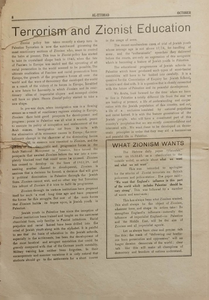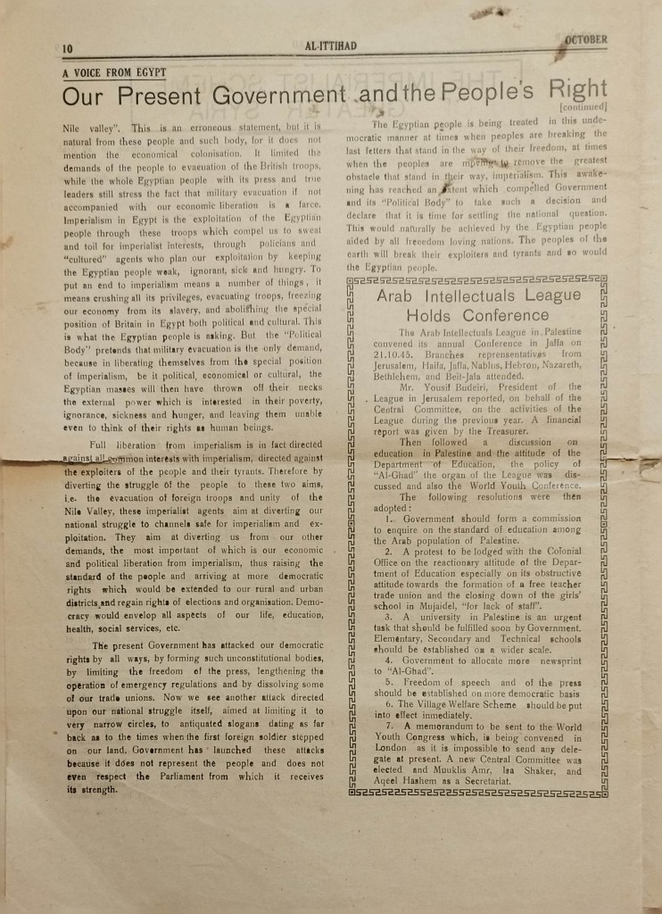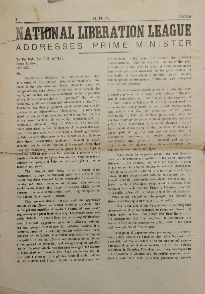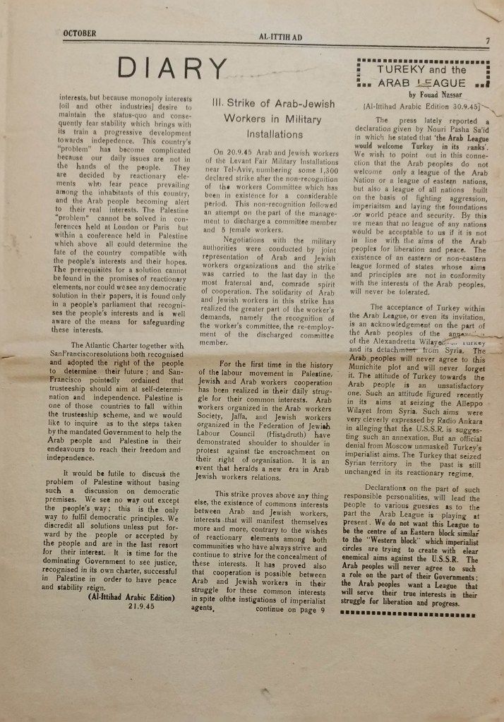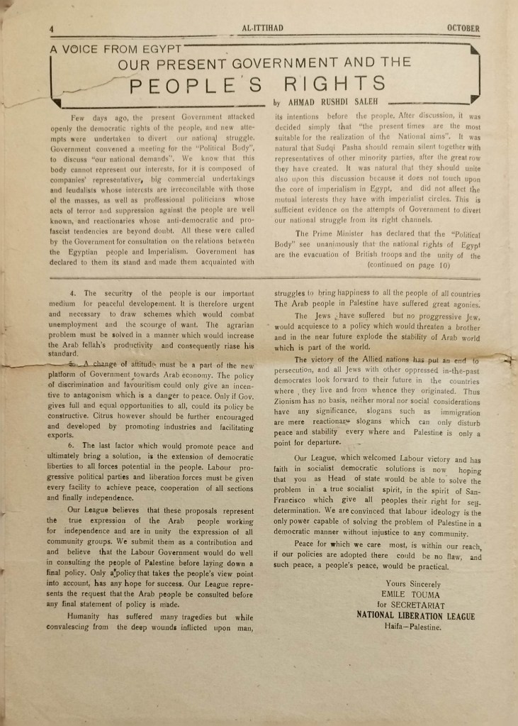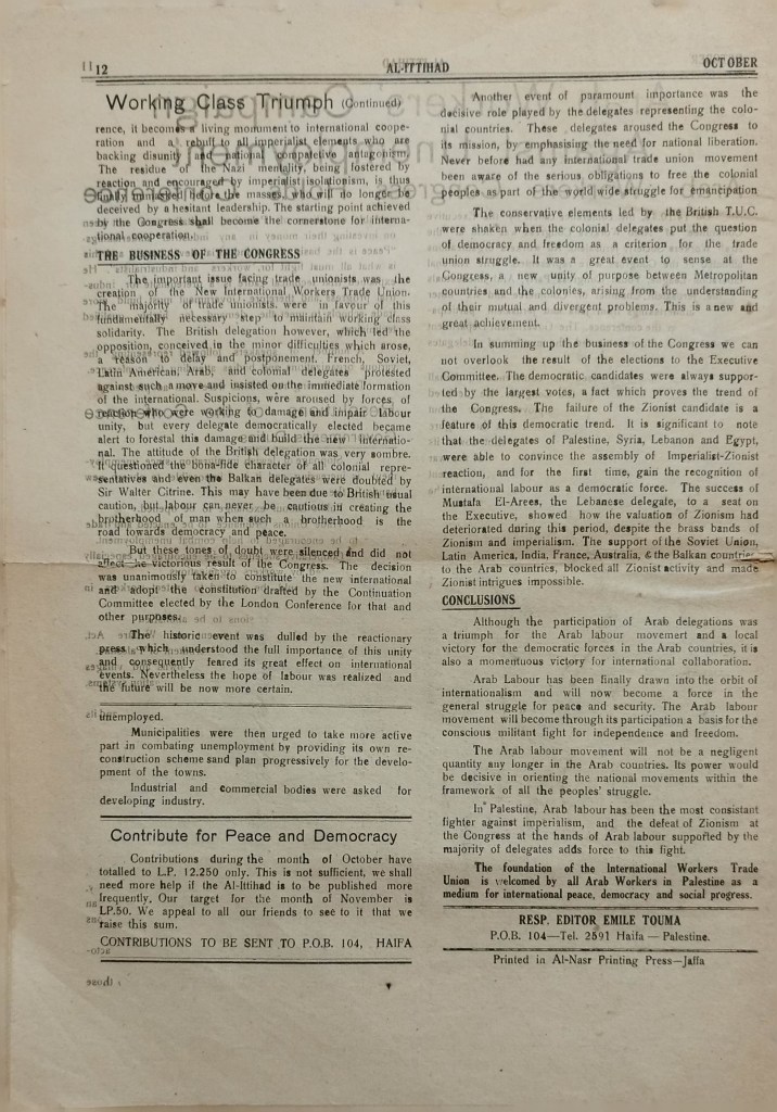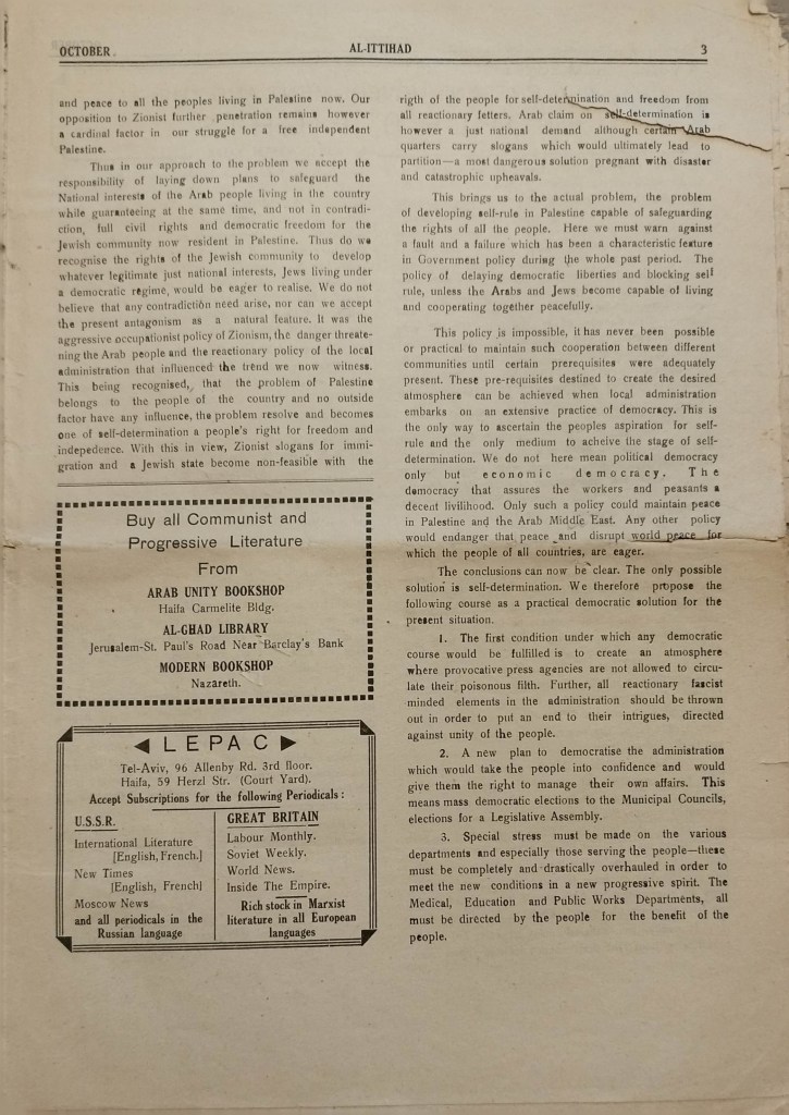 AL – ITTIHAD פורסם בתאריך פברואר 4, 2024 מאת erantorbiner ARAB LABOUR ORGAN A MONTHLY ENGLISH EDITION | VOL 1 No. 3 | 31st OCTOBER 1945 | RESP. EDITOR EMILE TOUMA | Haifa – Palestine שתף לחיצה לשיתוף ב-X (נפתח בחלון חדש) X לחיצה לשיתוף בפייסבוק (נפתח בחלון חדש) פייסבוק אהבתי טוען... קשור