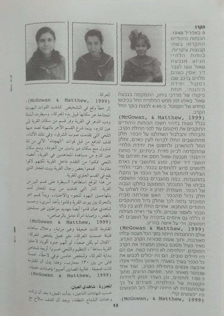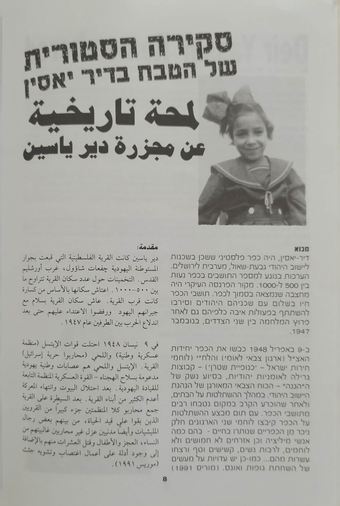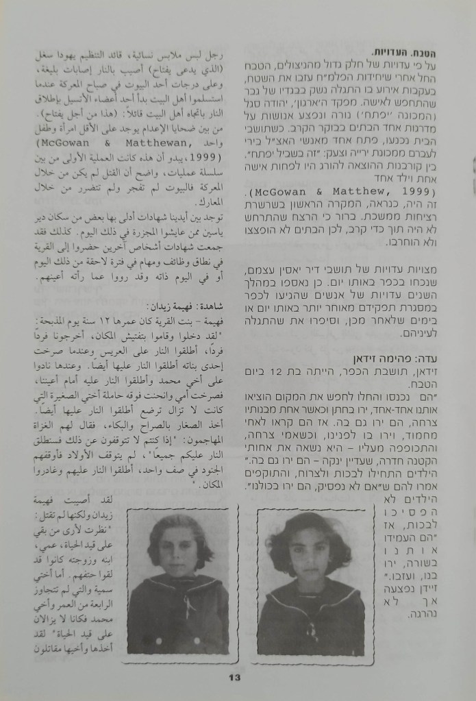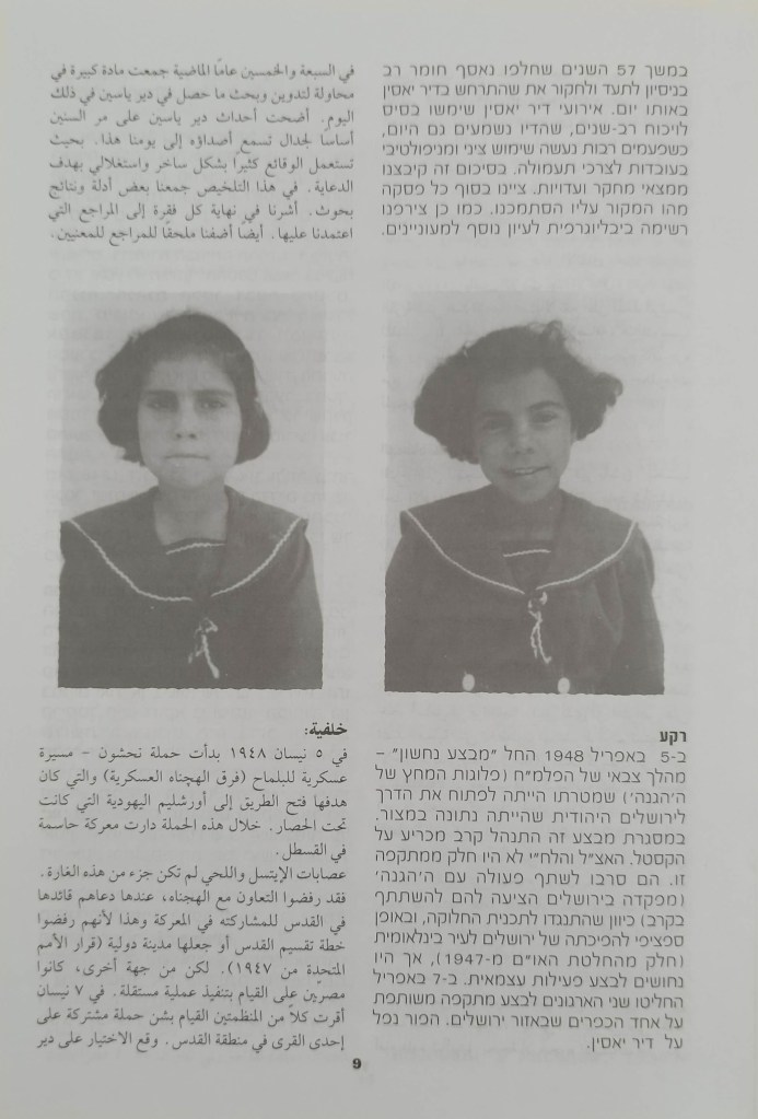 איסוף חומר: חירייה אבו שושה | עריכה: איתן ברונשטיין | כתיבה: דניאל מקגואן, סיימון ג'סטר, איתן ברונשטיין, נורמה מוסי, נעמה נגד, נדא מתא | תרגום: שאדי ח'לילה, וסים בירומי, עמית לנדאו, עומר אגבריה, נוואף עתאמנה, טוני חדאד | הגהה: סלים אבו ג'בל, איריס בר | עיצוב כריכה: טליה פריד | ציור שער: הדיל חאלד אלסילאוי (משכם), עבודה לזכר הטבח בדיר יאסין | הדפסה: הדפוס היפואי – אלראביטה | הפקה: עמותת זוכרות | במימון ועד הזיכרון של הכפר www.deiryassin.org | 2005