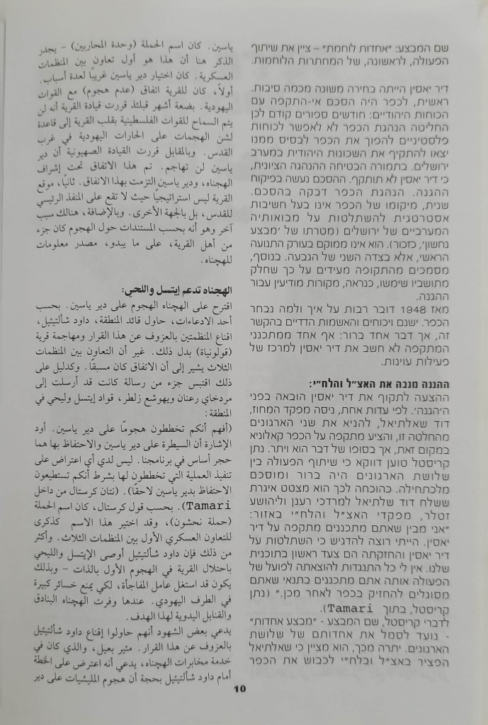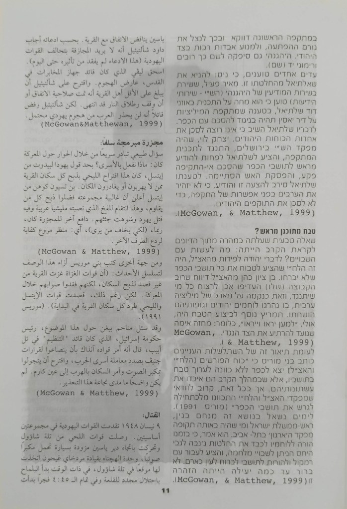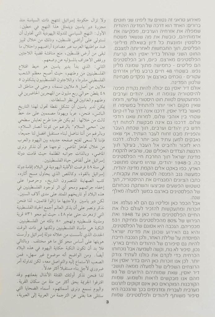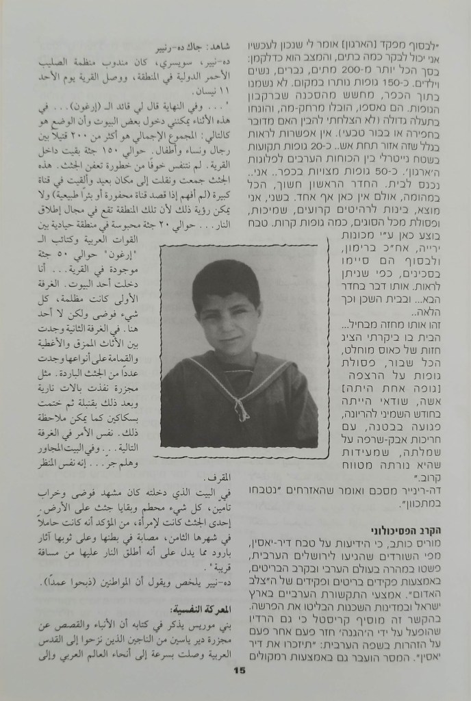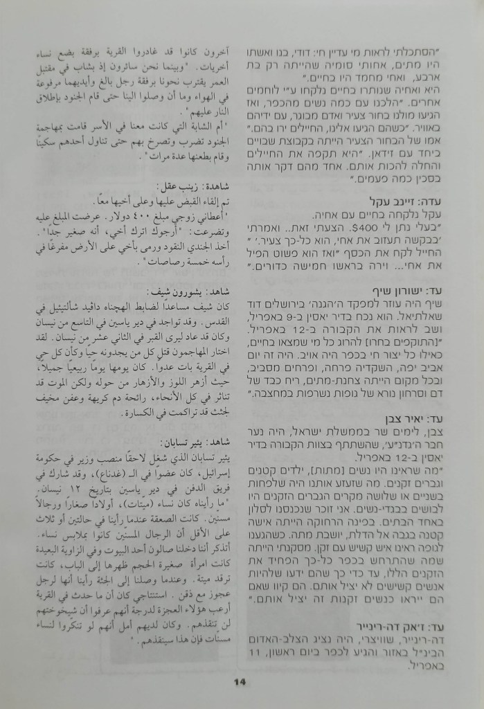 איסוף חומר: חירייה אבו שושה | עריכה: איתן ברונשטיין | כתיבה: דניאל מקגואן, סיימון ג'סטר, איתן ברונשטיין, נורמה מוסי, נעמה נגד, נדא מתא | תרגום: שאדי ח'לילה, וסים בירומי, עמית לנדאו, עומר אגבריה, נוואף עתאמנה, טוני חדאד | הגהה: סלים אבו ג'בל, איריס בר | עיצוב כריכה: טליה פריד | ציור שער: הדיל חאלד אלסילאוי (משכם), עבודה לזכר הטבח בדיר יאסין | הדפסה: הדפוס היפואי – אלראביטה | הפקה: עמותת זוכרות | במימון ועד הזיכרון של הכפר www.deiryassin.org | 2005
