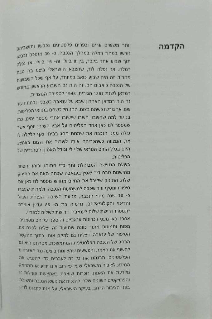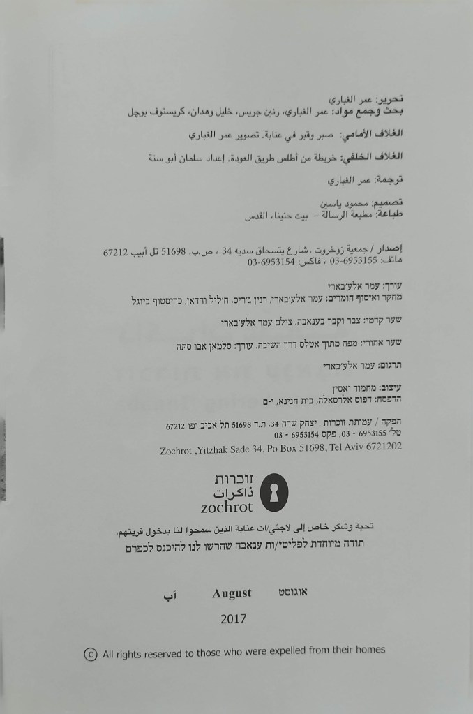 עורך: עמר אלע'בארי | מחקר ואיסוף חומרים: עמר אלע'בארי, רנין ג'ריס, חליל והדאן, כריסטוף ביוגל | תרגום: עמר אלע'בארי | עיצוב: מחמוד יאסין | הדפסה: דפוס אלרסאלה, בית חנינא, י-ם | הפקה: עמותת זוכרות | אוגוסט 2017