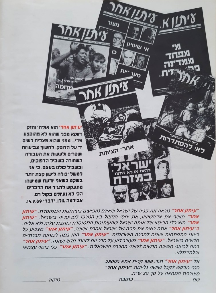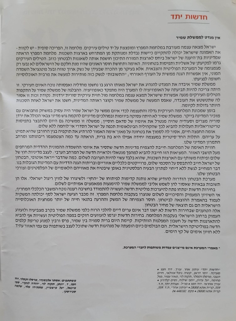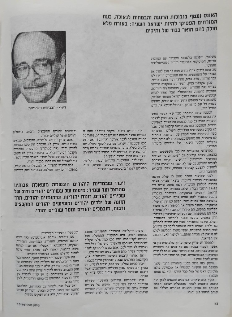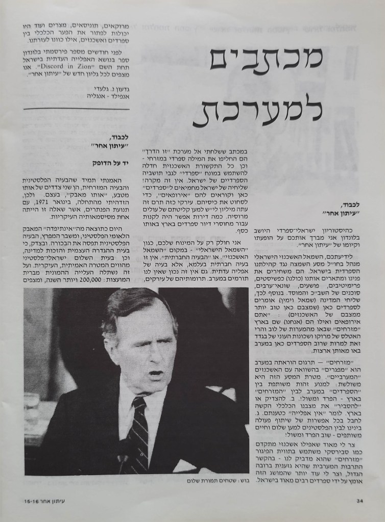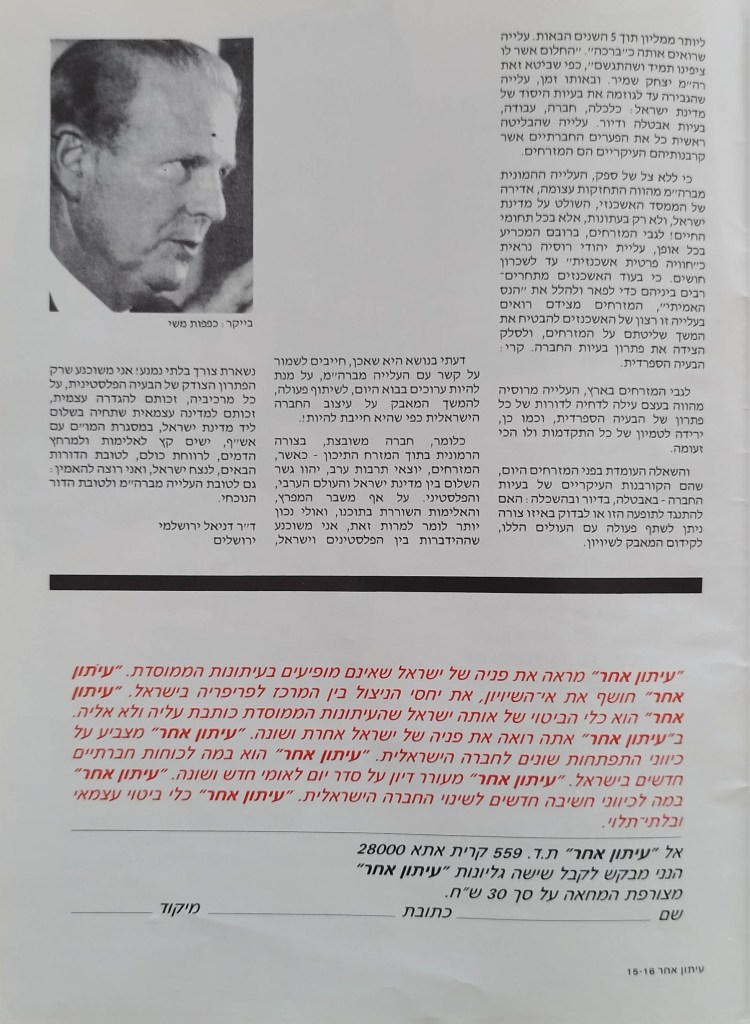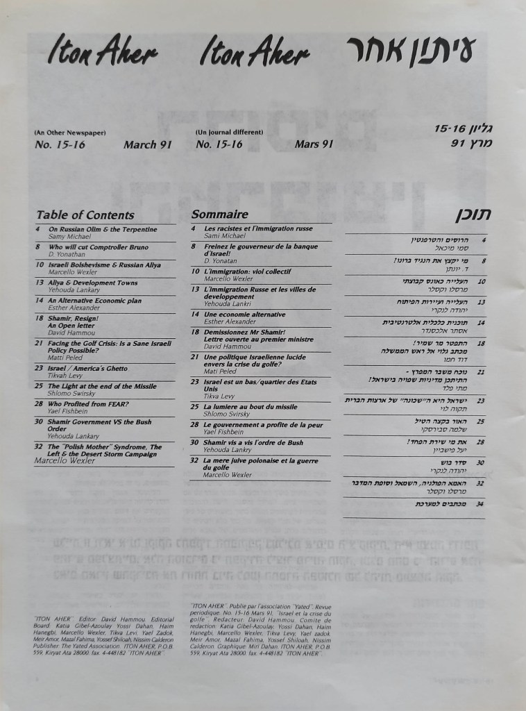 גליון 15-16 | מרץ 1991 | "חדשות יתד" עיתון אחר | עורך: דוד חמו | מערכת: יוסי דראן, קטיה גיבל-אזולאי, חיים הנגבי, מרסלו וקסלר, תקוה לוי, צאיר עמור, מזל פחימה, יעל צדוק, יוסף שילוח, נסים קלדרון