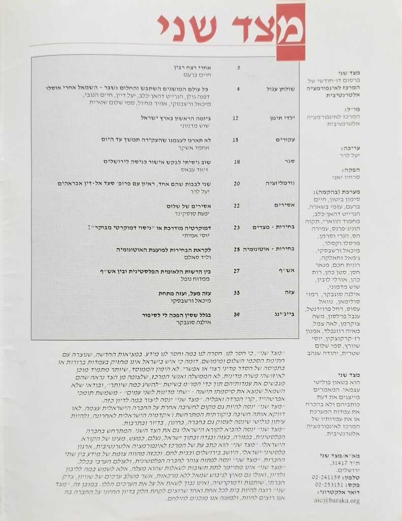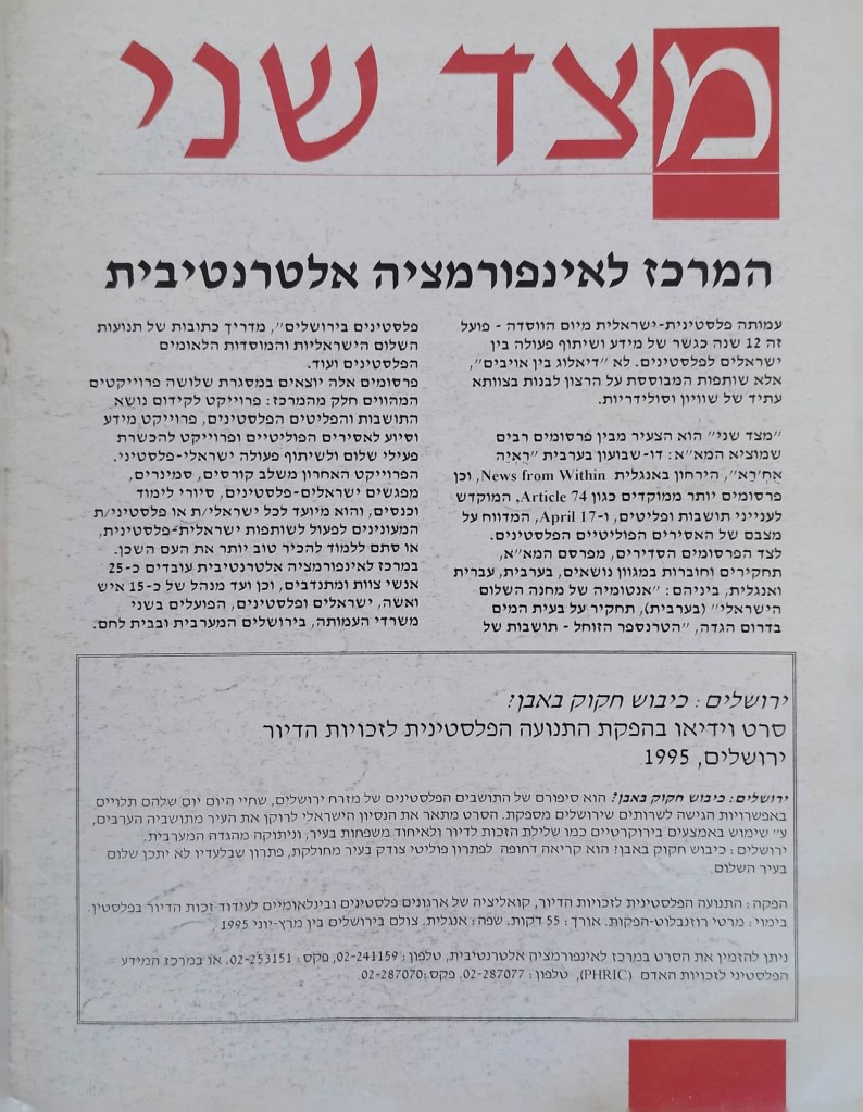 מצד שני פורסם בתאריך פברואר 12, 2024 מאת erantorbiner גליון מספר 1 | ינואר 1996 | עריכה: יעל לרר | הפקה: סרחיו יאני | מו"ל: המרכז לאינפורמציה אלטרנטיבית שתף לחיצה לשיתוף ב-X (נפתח בחלון חדש) X לחיצה לשיתוף בפייסבוק (נפתח בחלון חדש) פייסבוק אהבתי טוען... קשור