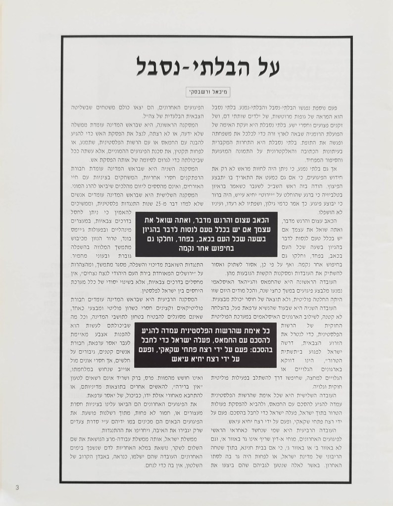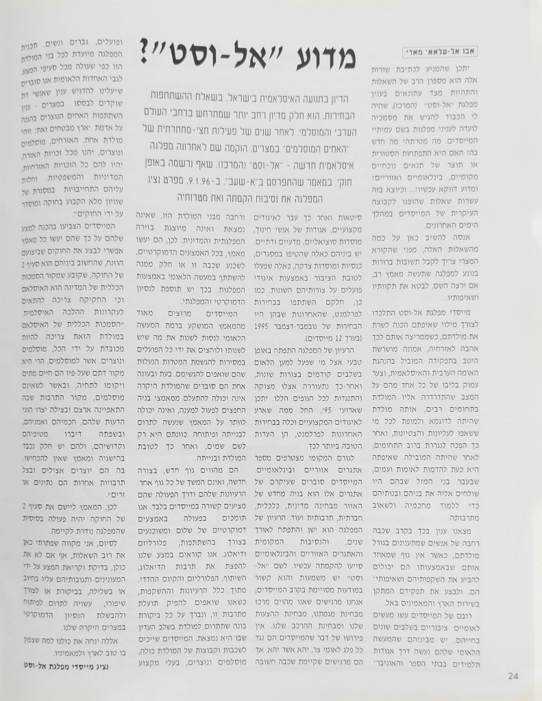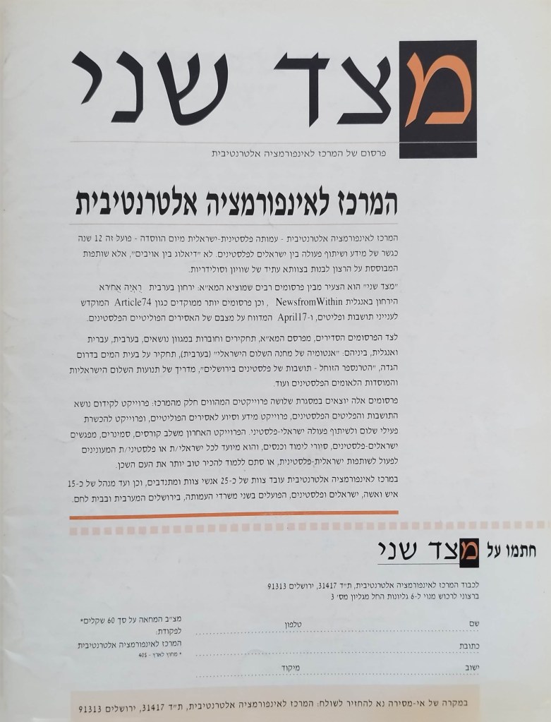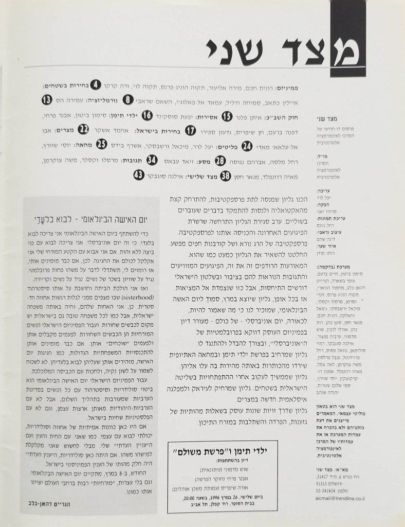 פרסום של המרכז לאינפורמאציה אלטרנטיבית | גליון מספר 2 | מרץ-אפריל 1996 | עריכה: יעל לרר | הפקה: סרחיו יאני | עריכת תמונות: רחל ג'ונס | עיצוב גרפי: דינה שהם | איור שער: רותו מודן