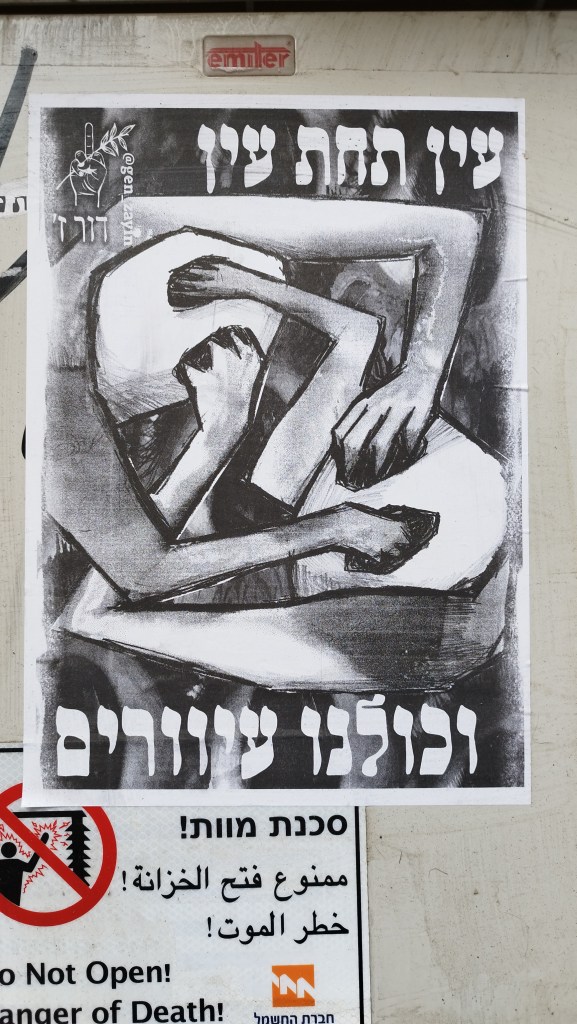 לחצו על התמונה לקריאת הפלייר השלםתאוות הנקם שביעבעה בציבור הישראלי לאחר אירועי השביעי באוקטובר הובילה לאלימות חסרת תקדים כלפי אזרחי הרצועה, פלסטינים מחוצה לה ובלתי מעורבים נוספים. הציבור הישראלי-יהודי מפגין עיוורון סלקטיבי כלפי זוועות אלו וממשיך לתמוך במערכת ששולחת אותו ואת בניו ובנותיו להילחם ולמות בעד קידוש מעגל הדמים. עין תחת עין וכולנו, מעורבים ובלתי מעורבים, אשמים ובלתי אשמים, הורים וילדים, נישאר עיוורים.צולם בתל אביב ב 13.2.2024צולם בתל אביב ב 13.2.2024צולם בתל אביב ב 13.2.2024צולם בתל אביב ב 13.2.2024צולם בתל אביב ב 13.2.2024