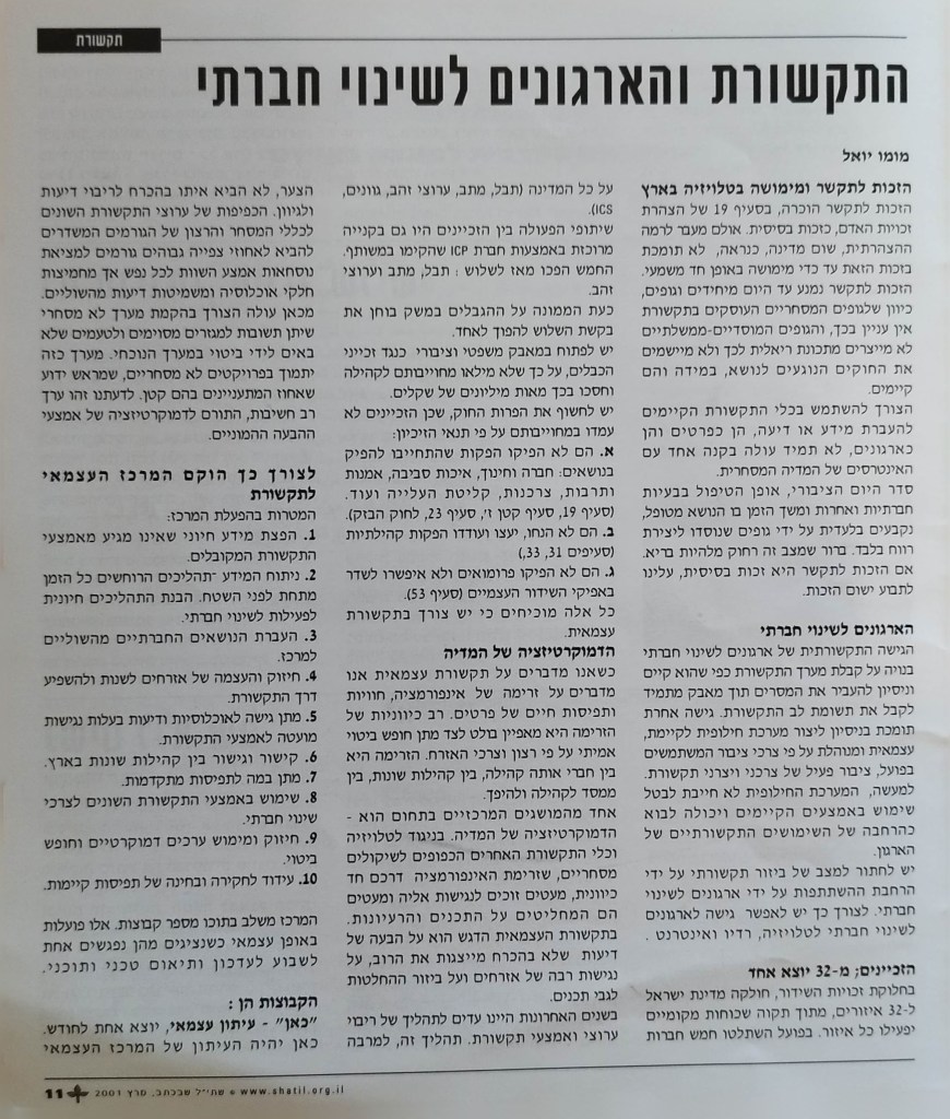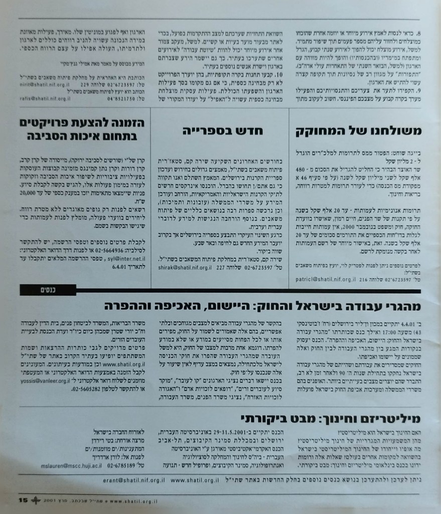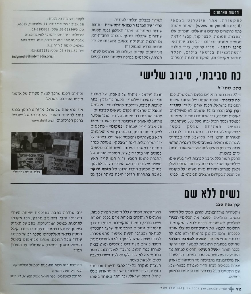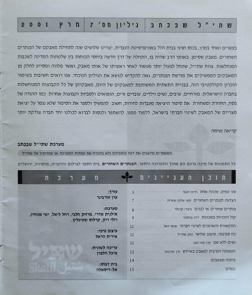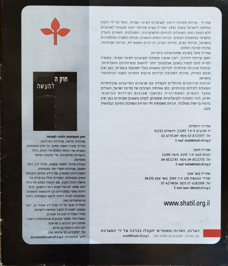 יוצא לאור ע"י שתי"ל – שירות תמיכה וייעוץ לארגונים לשינוי חברתי מיסודה של הקרן החדשה לישראל | עורך: ערן טורבינר | מערכת: אילנית אדרי, מרזוק חלבי, רחל ליאל, ישי מנוחין, רולי רוזן, קרלוס שטיגליץ | עיצוב גרפי: אירית הראל | עריכה לשונית: מיכל הלפרן | בית דפוס: אל-ריסאלה