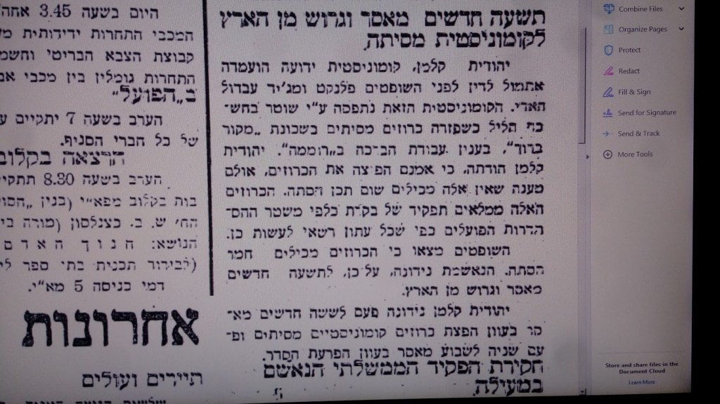 Yehudit was born on December 25, 1905 in the Chernivtsi area, arrived in Palestine in the mid-twenties and joined the Communist Party (PKP). Yehudit was arrested many times for her activities in the party and her daughter, Roda, was born while imprisoned in Bethlehem prison in 1937. After this imprisonment, she left with her daughter the country and moved to Paris. During the German occupation, she hid in Joigny, a small town south of Paris but she was captured and sent to Drancy and later to the Vital concentration camp. After the liberation she returned to Paris with her daughter. Yehudit continued her activity in the Communist Party and wrote in Naye Prese, a Yiddish-language communist daily newspaper published in Paris. She died of cancer in 1978 and was buried in Père Lachaise Cemetery.