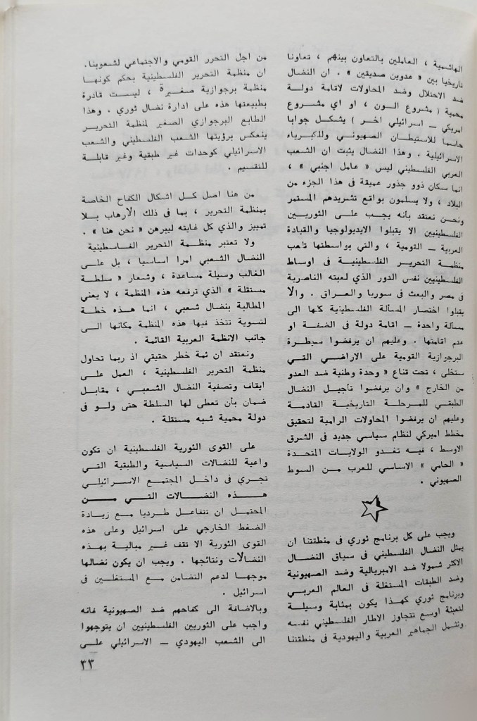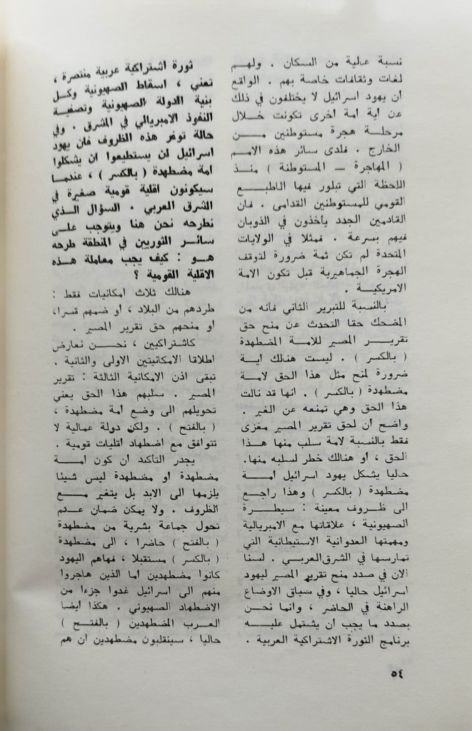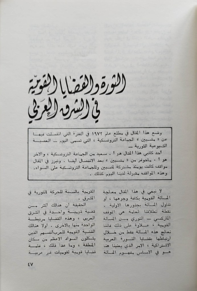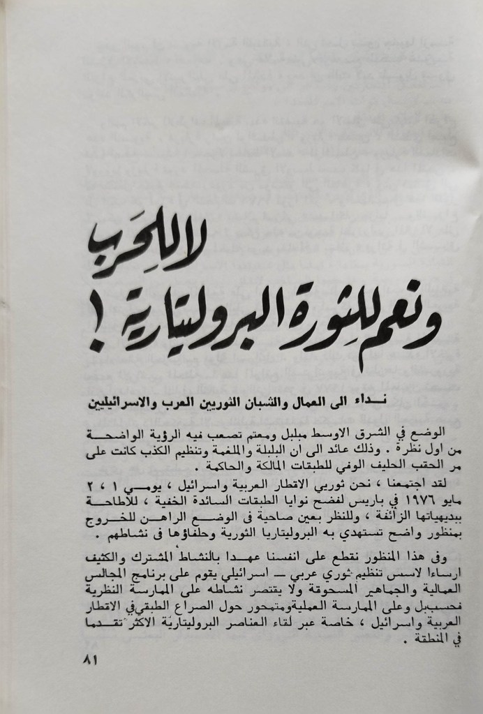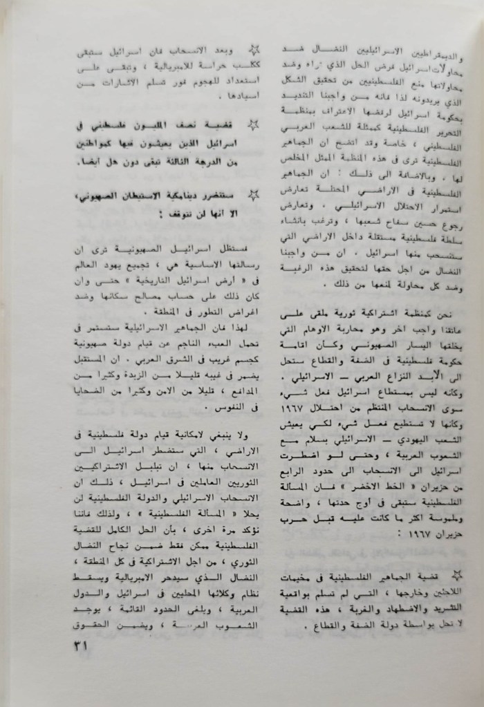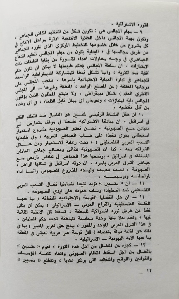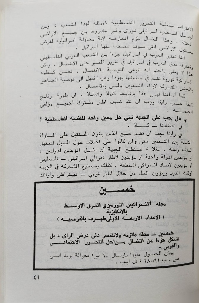 متسبين أيّدت الحقوق القومية والانسانية للفلسطينيين ونادت بحل جميع المشاكل الاقليمية سواء كانت قومية ام اجتماعية وذلك عن طريق النضال من أجل اسقاط جميع الانظمة في المنطقة واقامة مشرق عربي موحد واشتراكي.