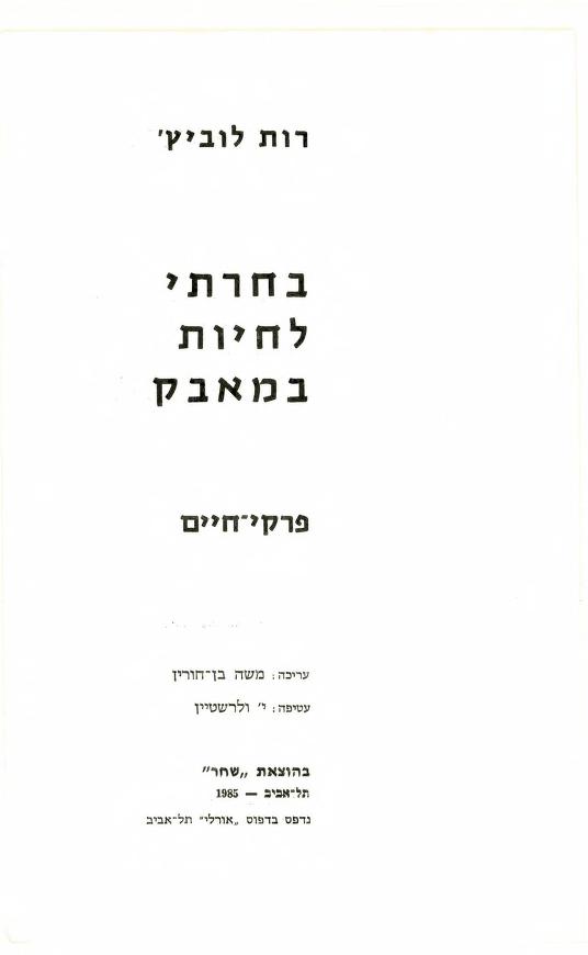 עריכה: משה בן-חורין | עטיפה: י. ולרשטיין | בהוצאת 'שחר' | דפוס: 'אורלי' | תל-אביב | 1985