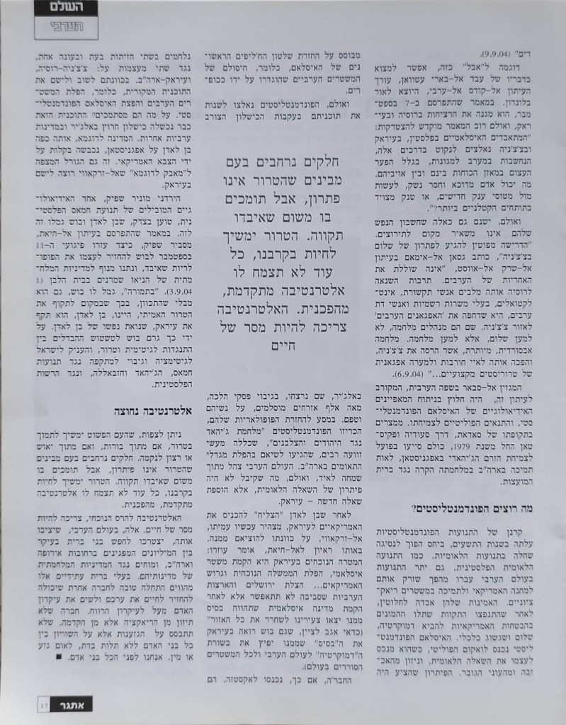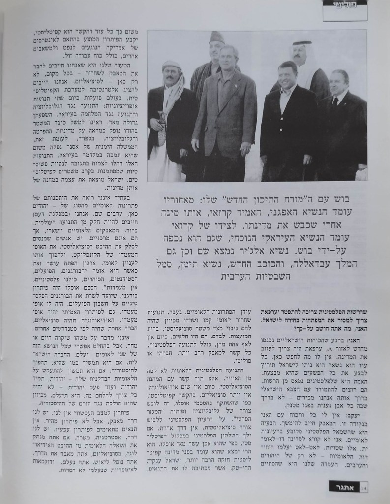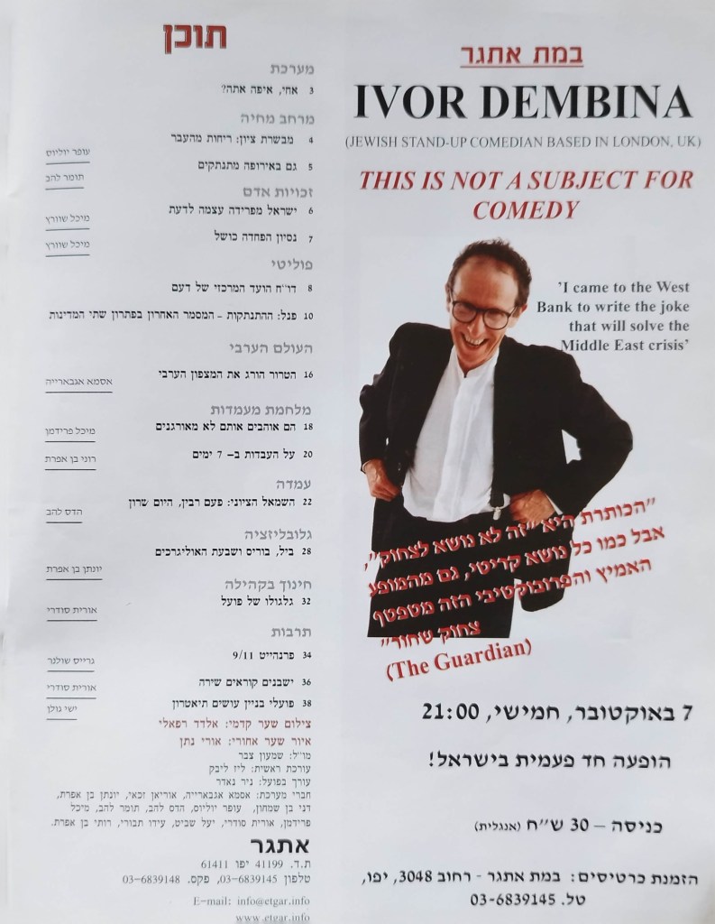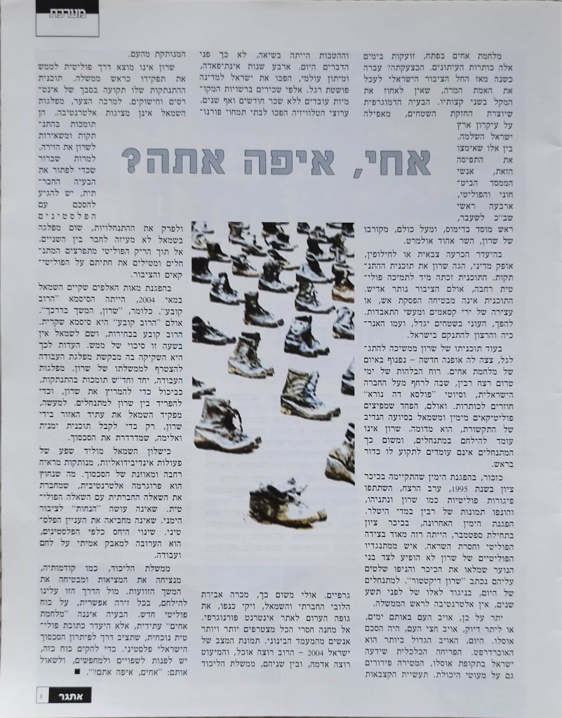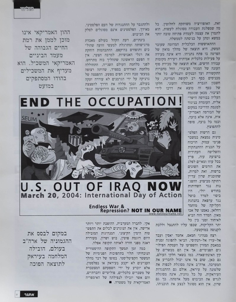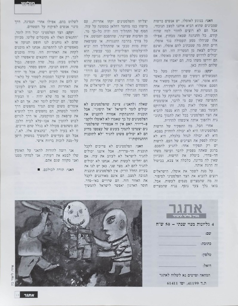 מגזין פוליטי תרבותי | מו"ל שמעון צבר | עורכת ראשית: ליז ליבק | עורך בפועל: ניר נאדר | חברי מערכת: אסמא אגברייה, אוריאן זכאי, יונתן בן אפרת, דני בן שמחון, עופר יוליוס, הדס להב, תומר להב, מיכל פרידמן, אורית סודרי, יעל שביט, עידו תבורי, רותי בן אפרת | צילום שער קדמי: אלדד רפאלי | איור שער אחורי: אורי נתן | גליון מספר 14 | ספטמבר 2004