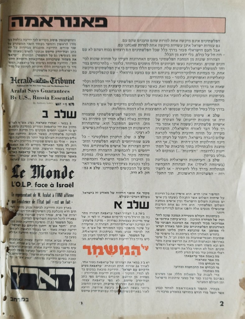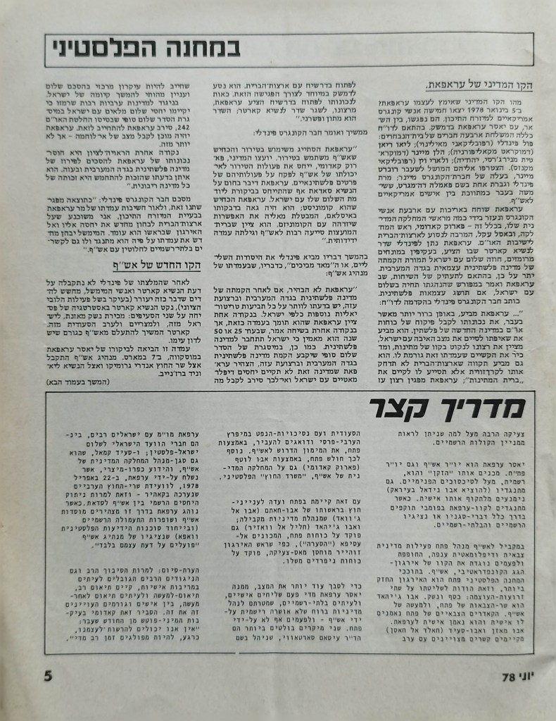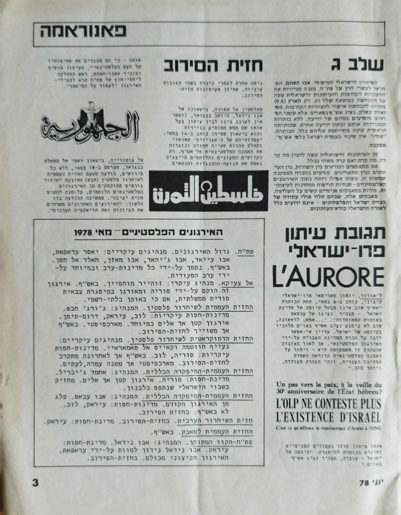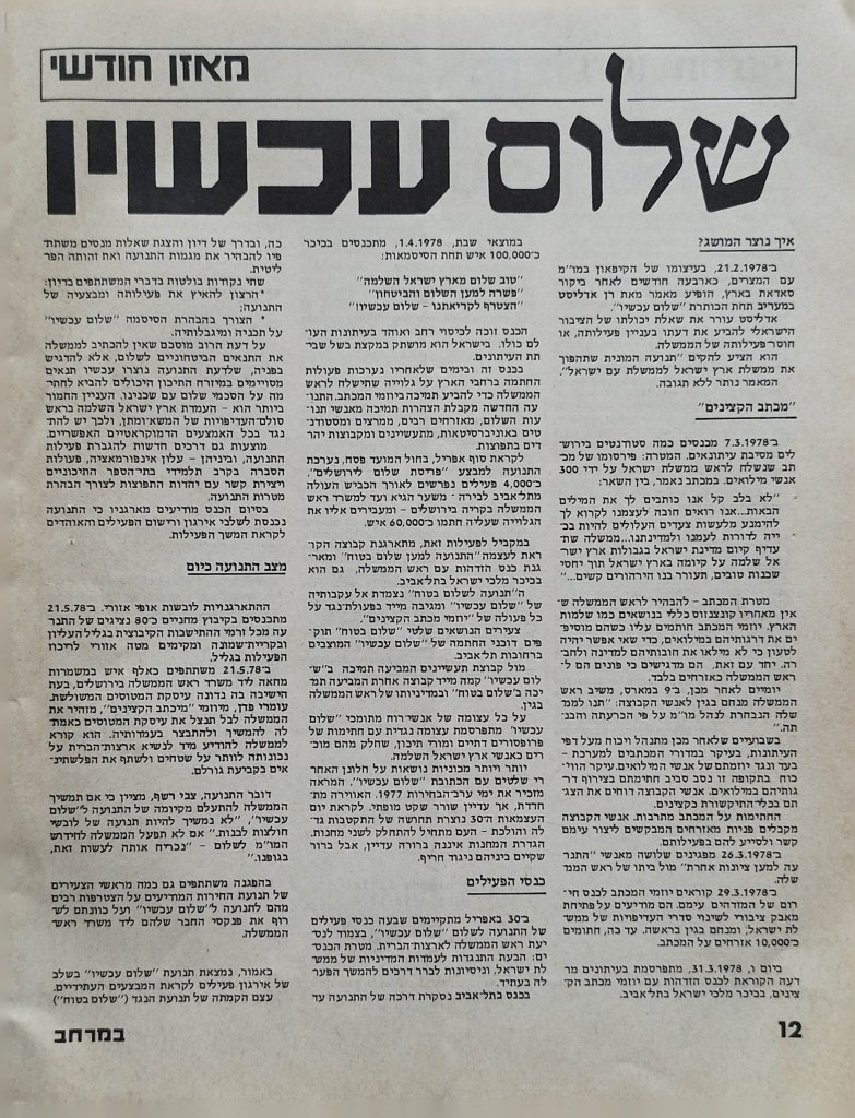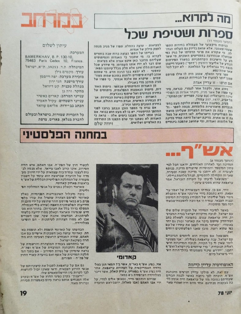 עיתון לשלום | העורך : מקסים גילן | מזכירת מערכת: יפה וייסמן | עורך משנה: חגי ירון | מנהלת טכנית: קט דיוואל | מחקר: ורה גן | ענייני המרחב: קארים באשיר | ענייני השטחים: עקיל חאמיד | הכתב בביירות: אליאס עוואד | גליון מספר 1 | יוני 1978