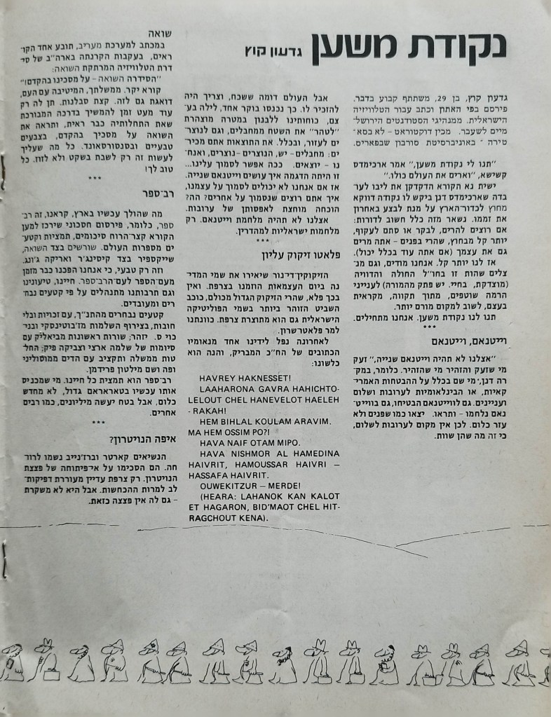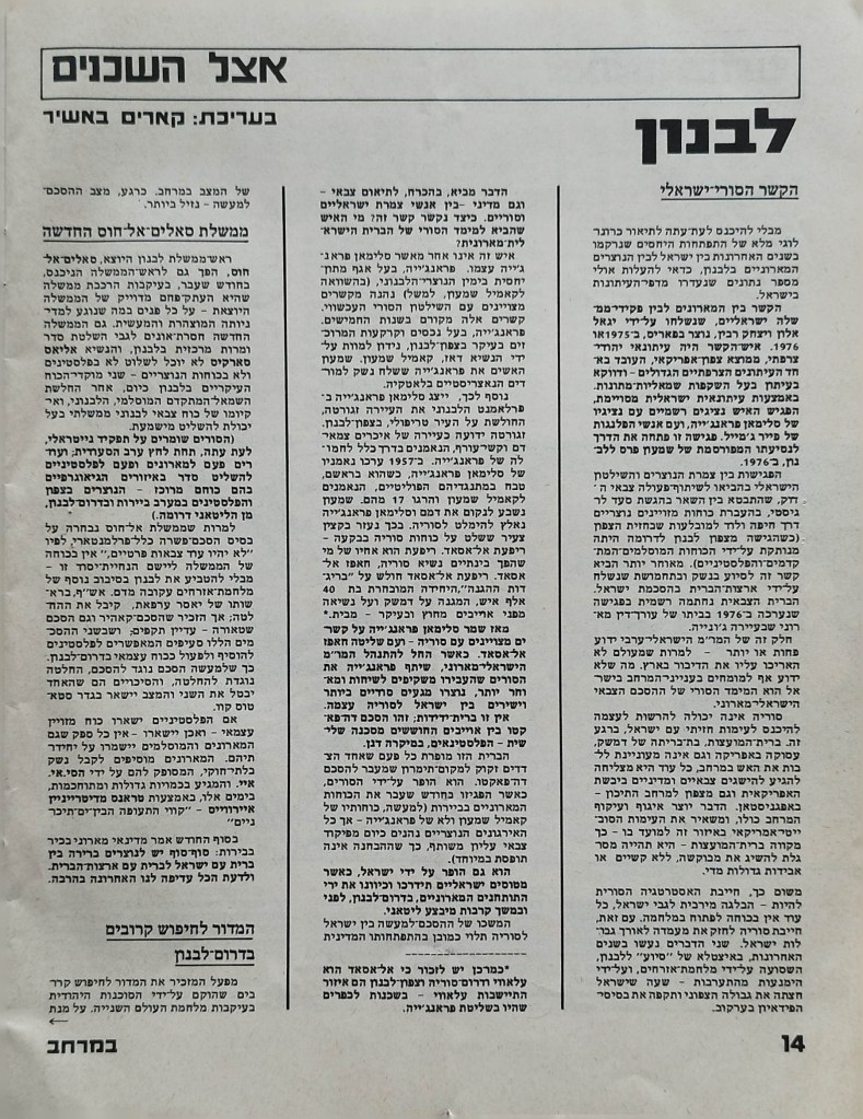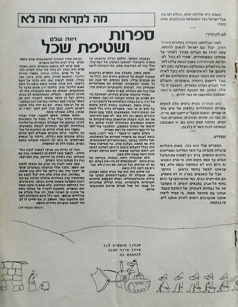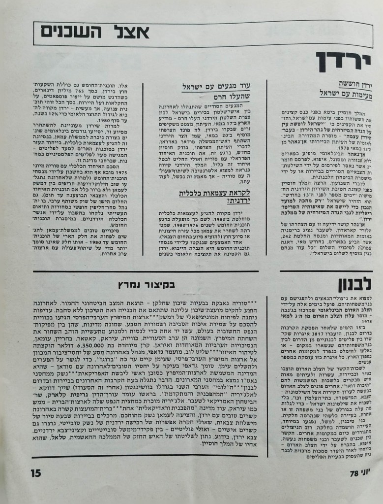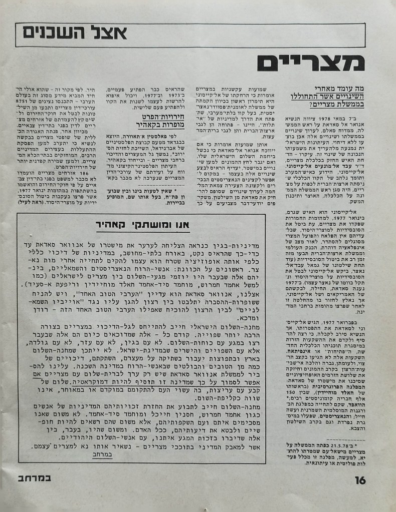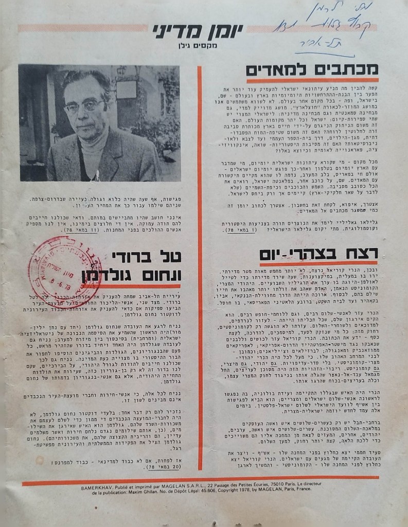 עיתון לשלום | העורך : מקסים גילן | מזכירת מערכת: יפה וייסמן | עורך משנה: חגי ירון | מנהלת טכנית: קט דיוואל | מחקר: ורה גן | ענייני המרחב: קארים באשיר | ענייני השטחים: עקיל חאמיד | הכתב בביירות: אליאס עוואד | גליון מספר 1 | יוני 1978