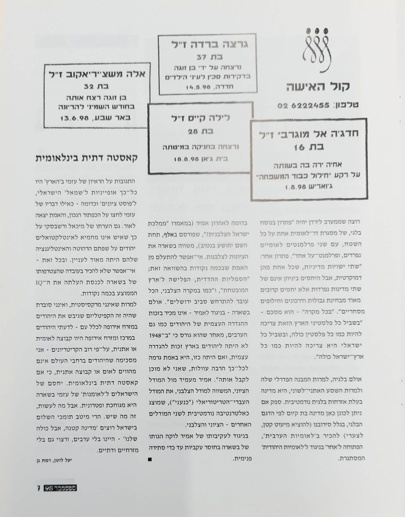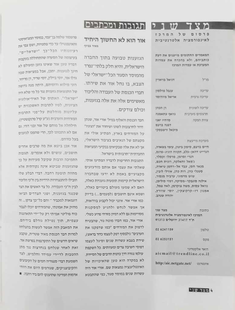 המרכז לאינפורמציה אלטרנטיבית | מו"ל: דניאל בויארין | עריכה: ענבל פרלסון | עריכה גרפית: אריאל מיודוסר | עריכה לשונית: רן הכהן | תרגומים מערבית: נוואף עתאמנה | צוות הפקה: סרחיו יאני, דפנה ברעם, מיכאל ורשבסקי
