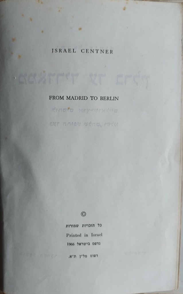ממדריד עד ברלין | ישראל צנטנר פורסם בתאריך יוני 12, 2024 מאת erantorbiner FROM MADRID TO BERLIN | JSRAEL CENTNER לוחמים ארץ-ישראליים בעד החופש שלהם, ושלנו הוצאת המחבר | דפוס מל"ן | תל אביב | 1966 שתף לחיצה לשיתוף ב-X (נפתח בחלון חדש) X לחיצה לשיתוף בפייסבוק (נפתח בחלון חדש) פייסבוק אהבתי טוען... קשור