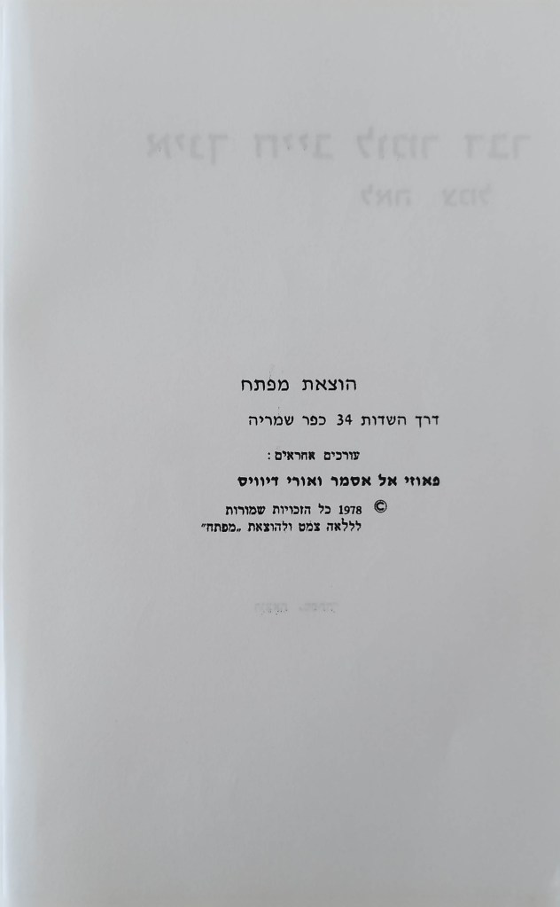 אינך חייב לומר דבר | לאה צמל פורסם בתאריך יולי 8, 2024 מאת erantorbiner הוצאת מפתח, דרך השדות 34 כפר שמריהו | עורכים אחראים: פאוזי אל אסמר ואורי דיוויס | 1978 שתף לחיצה לשיתוף ב-X (נפתח בחלון חדש) X לחיצה לשיתוף בפייסבוק (נפתח בחלון חדש) פייסבוק אהבתי טוען... קשור