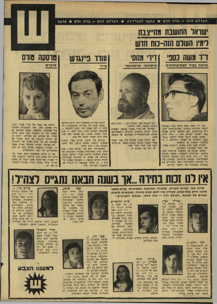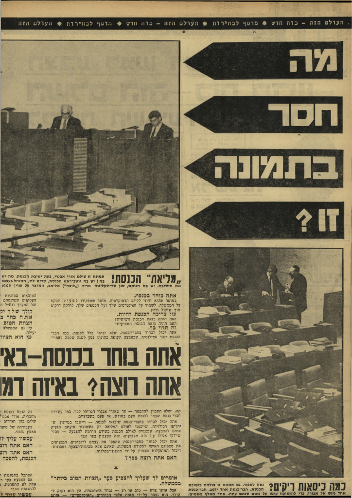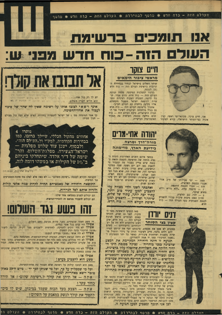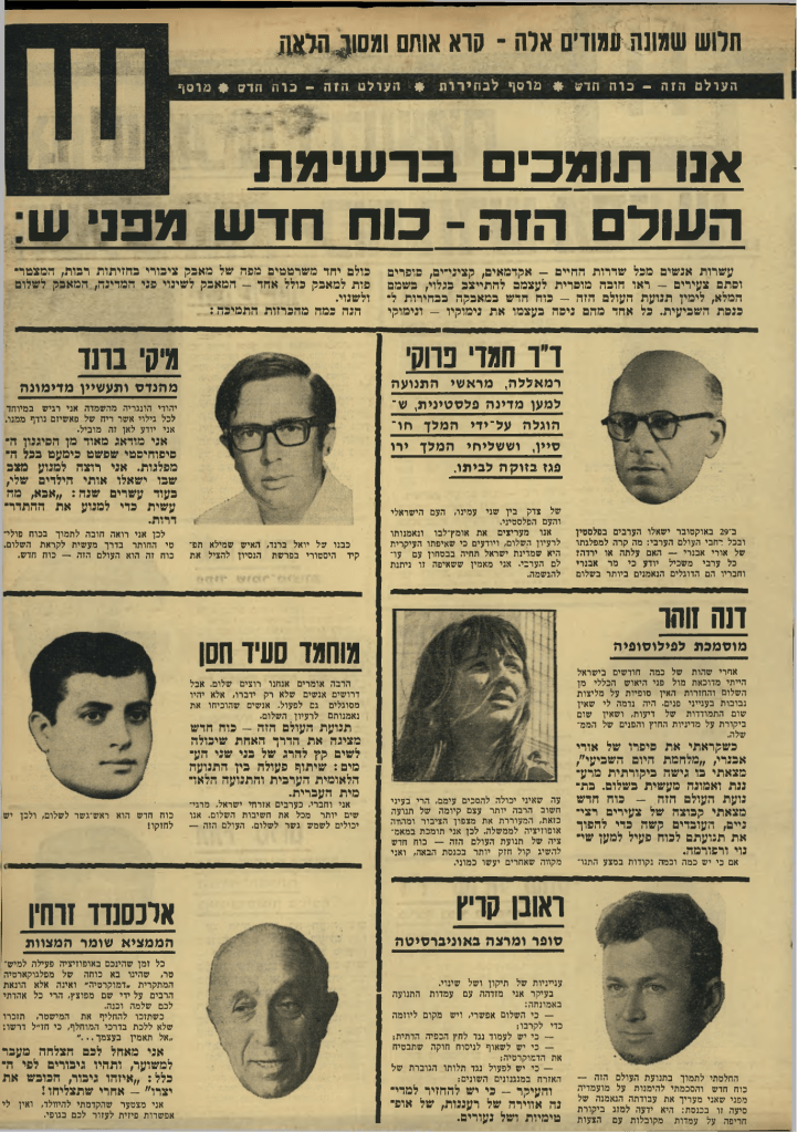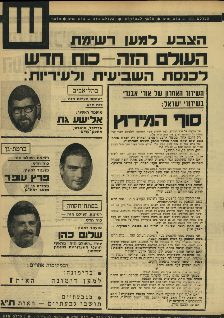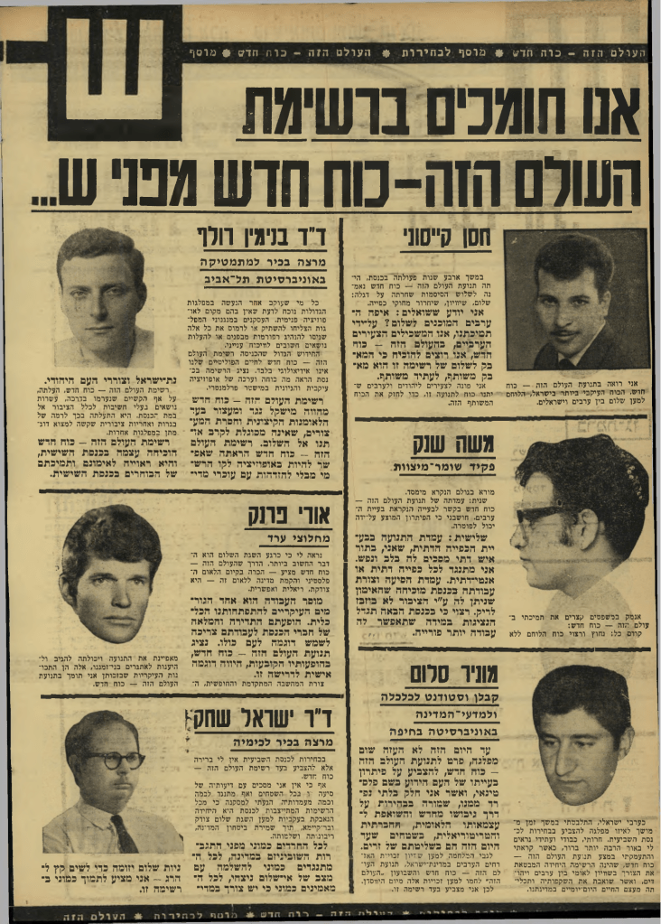 המפלגה הוקמה לקראת הבחירות לכנסת השישית בשנת 1965 על ידי אורי אבנרי ושלום כהן, עורכי השבועון "העולם הזה", בתגובה לחקיקת חוק איסור לשון הרע. בבחירות אלה זכתה המפלגה במנדט יחיד, שהפך את אורי אבנרי לחבר הכנסת. אבנרי היה לאחד הח"כים הפעילים והבולטים במשך התקופה שבה היה חבר הכנסת. התנועה הוקמה על מנת להילחם בחוק איסור לשון הרע, אך מצעה היה רדיקלי ואנטי־ממסדי ובעיקר הקריאה להכרה בעם הפלסטיני שנחשבה אז לכפירה בעיקר. המפלגה פעילה מ1965 ועד 1973 (הכנסת השישית והשביעית).