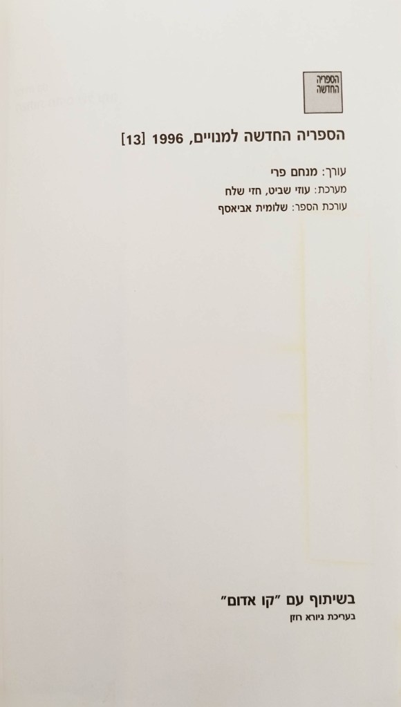 עורך: מנחם פרי | מערכת: עוזי שביט, חזי שלח | עורכת הספר: שלומית אביאסף | בשיתוף 'קו אדום' בעריכת גיורא רוזן | עיצוב העטיפה: יעל שוורץ | הצילום שעל העטיפה: אלכס ליבק | כל הזכויות שמורות למחברת ולהוצאת הקיבוץ המאוחד | נדפס בדפוס 'חדקל' | ישראל | 1996